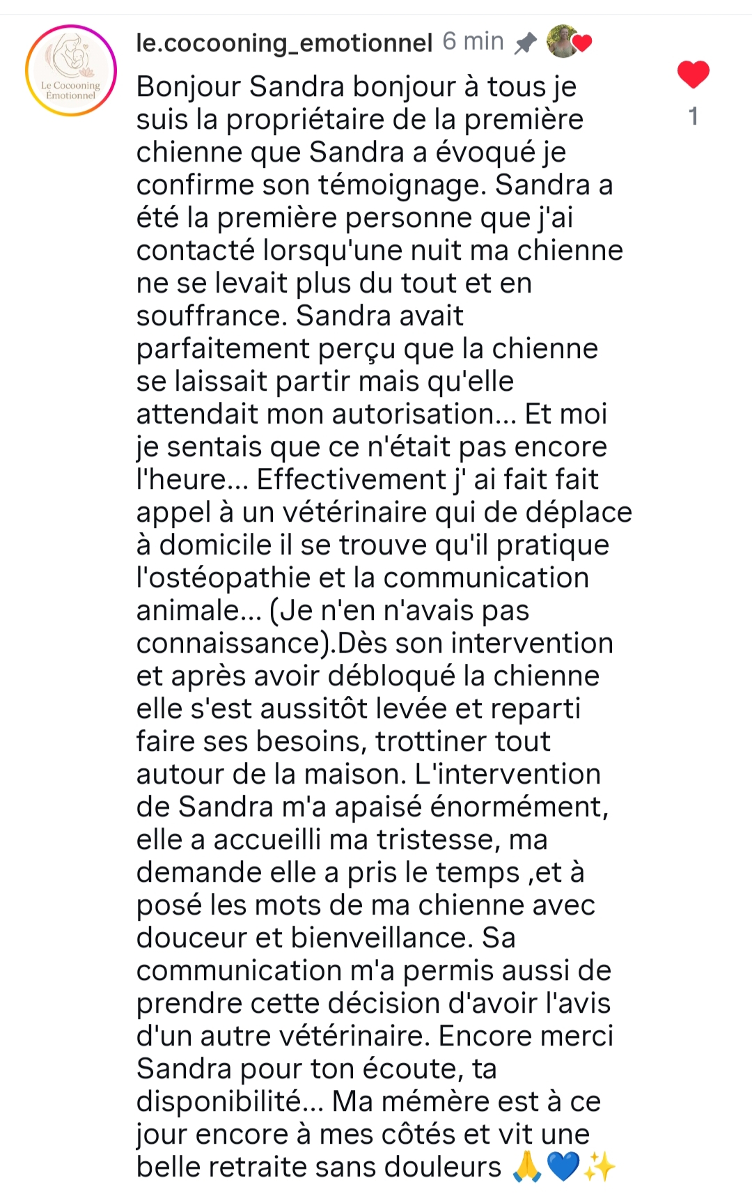 J'ai gagné la communication animale avec Sandra et j'en étais vraiment heureuse et je vous la recommande ++++. Elle a passé un certain temps 🙈 avec moi au téléphone à me guider, m'expliquer....bref une belle âme, généreuse au grand coeur 😍 tout ce que j'aime et comme j'ai bp de ressentis : de belles vibrations....